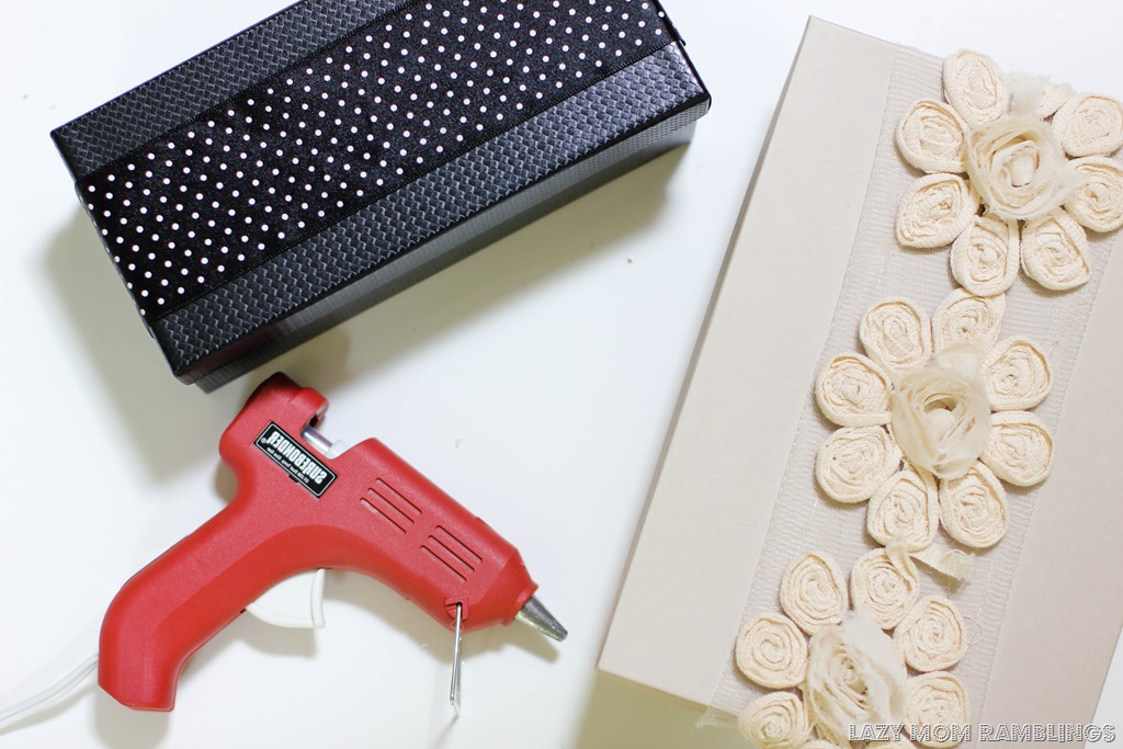 All you need is : a hot glue gun / any kind of ribbon, lace, fabric strip / the gift box you’d like to repurpose
