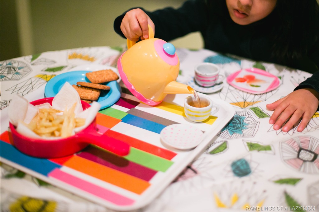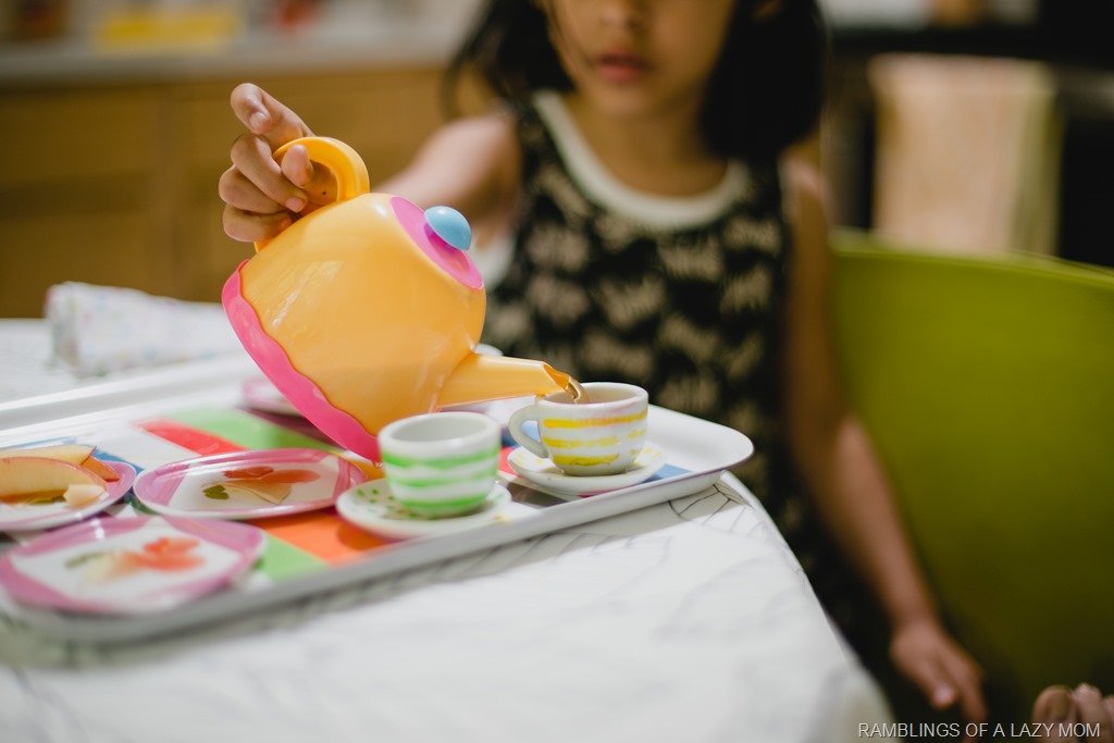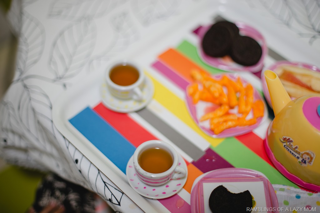 Anya loves setting up picnics and tea parties for us all the time and we do them at least a couple times every day. However she specially loves when we do this, make some real tea and snacks for her tea parties! I had some strawberry flavored tea bags in my pantry one day and on a whim made a lightly brewed mug of tea for her tea party and she absolutely enjoyed it. Now it’s become a tradition!