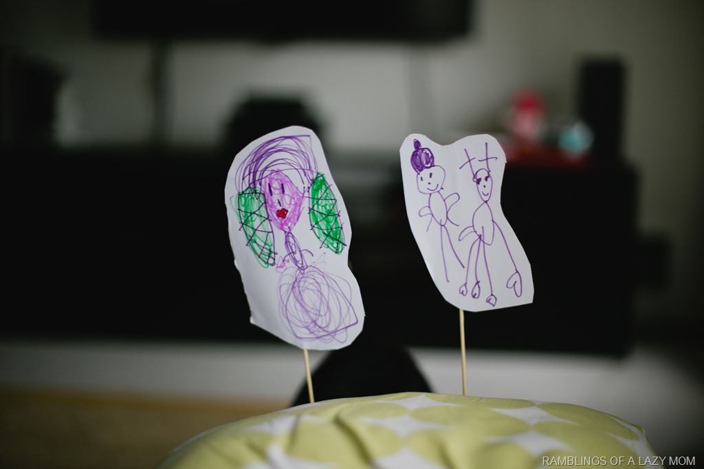 She has finally caught the Elsa-Anna-Frozen craze and loves drawing them. She brought her drawing of them one day with her scissors and got me to cut them out for her and told me she needed some popsicle sticks to stick on the back! I did not have them but had wooden skewers which did the job.