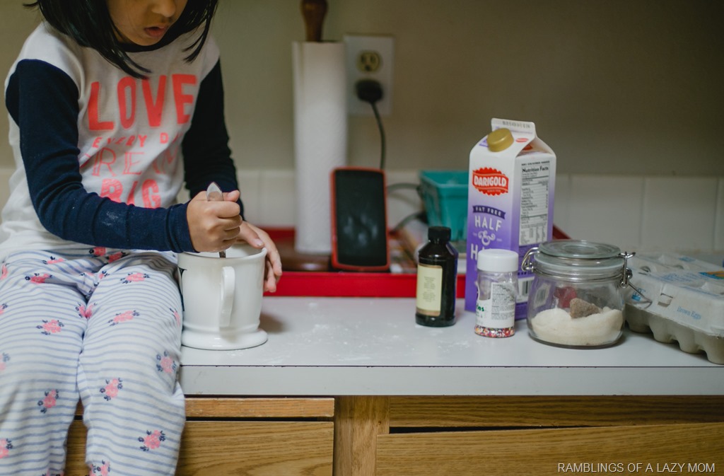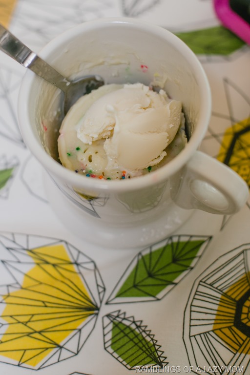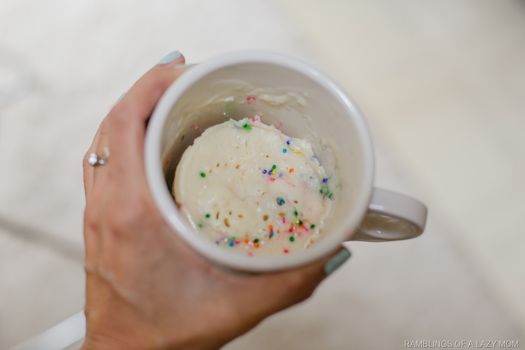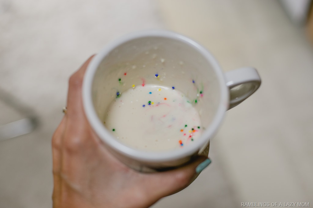 We (mostly me, to be honest)have been really fascinated by mug cakes since seeing them on Pinterest and last Friday, on a lazy morning at home (A has Fridays off this year) decided to give it a try. I had this pinned and Anya chose the confetti one from the options we had. It is super simple and the only tricky part is the number of minutes you give it in the microwave as it varies depending on the strength of each model. We found out that its best to be safe and heat it in 30 second bursts on high, to make sure you don’t overcook it.