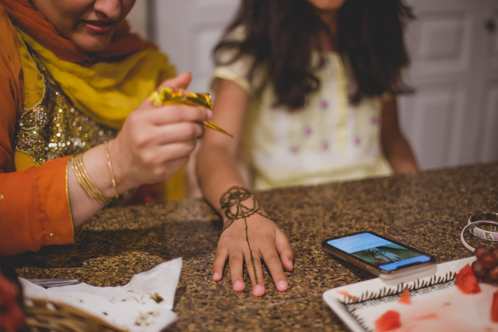 For Chand Raats, I love a simpler mommy & kids (or family) celebration and these photos are from the time I hosted a few years ago. I find these easiest to do with just your closest friends so you can do one main dish for dinner followed by lots of desserts maybe. The point is to just have fun and chat as girls get henna and maybe paint their nails. (Reminder to have lots of henna and maybe nailcolors out too in advance. I forgot haha). I also put on some Pakistani movie dance songs so kids could dance along in their traditional clothes afterwards. Here’s my YouTube playlist.