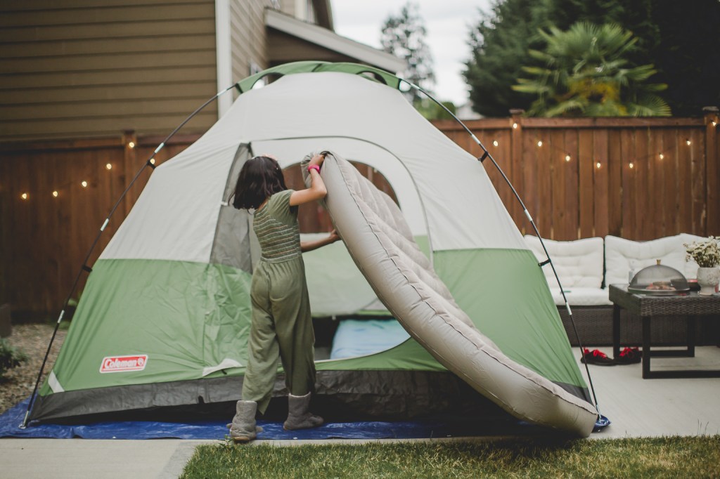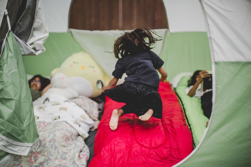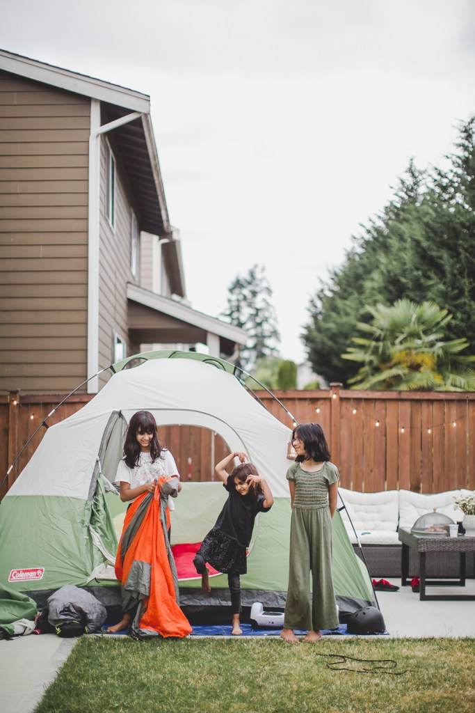 ON KEEPING IT LOW-STRESS : I had so much going on with my trip coming up so I was very conscious of doing this in a way that is memory-making for them but also low-stress for me & my friend who was leaving right after to see her mom. I made sure setting up & cleaning up was on them and part of the fun so while I stayed around, these outdoorsy-adventure loving girls set up the tent (with Bilal’s help), filled up the air mattresses on their own. I made sure they cleaned up the next day too. I laid out snacks for them & also planned for pizza for dinner; they did want “keema roti” which I was making for us so that was dinner then.